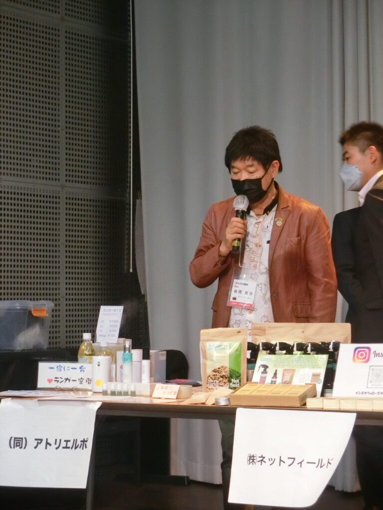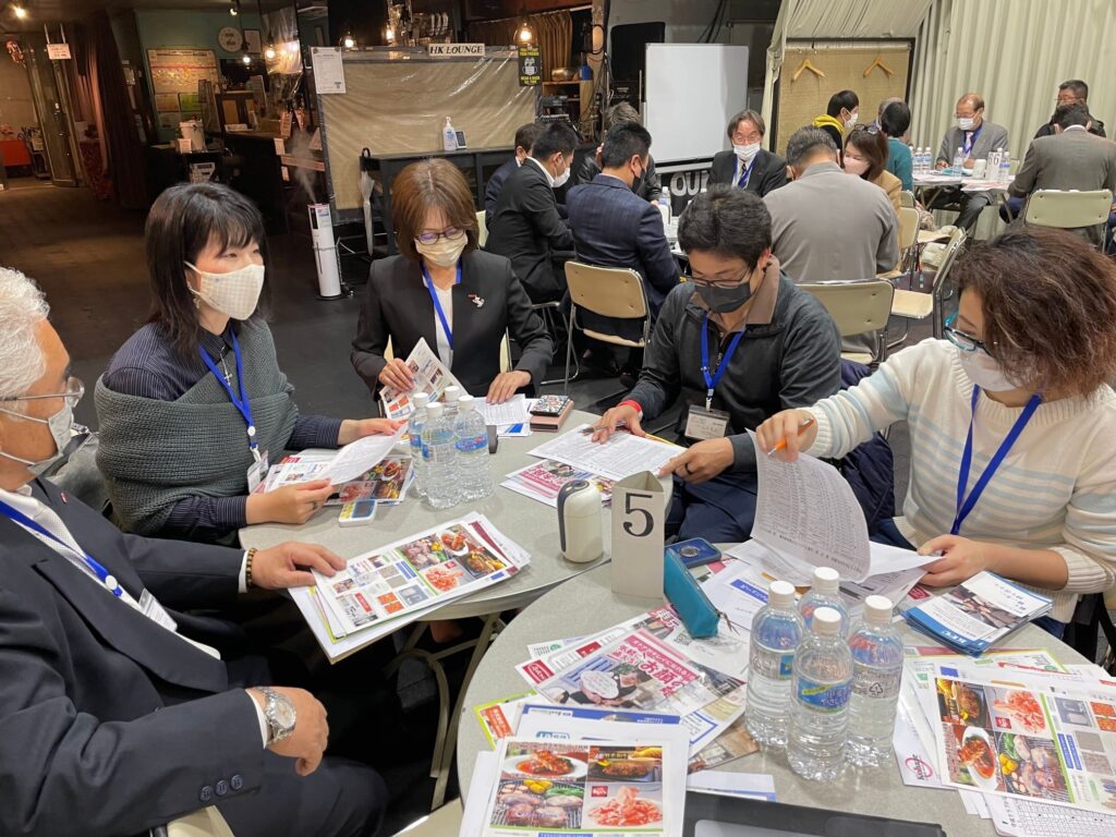 映像PRタイムは、(株)コンテックス、(株)バズージャパンの2社でしたが、大画面での自社商品等PRぜひをご活用ください。ブース出展は、アトリエルポ社、美咲樹社、昭和商事社、ネットフィールド社、企画チームエスペランサの5社でした。大名刺交換会~集合写真~車座商談活発にありがとうございます。